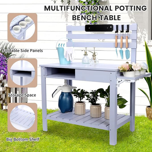 Kids Potting Bench Table Outdoor Garden Table Wooden Work Station Outdoor Garden Work Bench Platform with 3 Side Hook Shelf Natural Wood Blue Gift for Boys Girls