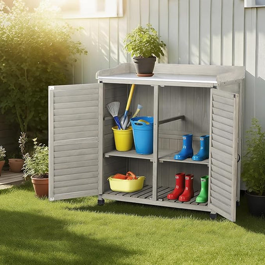 Outdoor Potting Bench with Metal Work Top,Waterproof Garden Storage Cabinet,Wooden Tool Station Shed for Backyard,Patio,Lawn Gardening