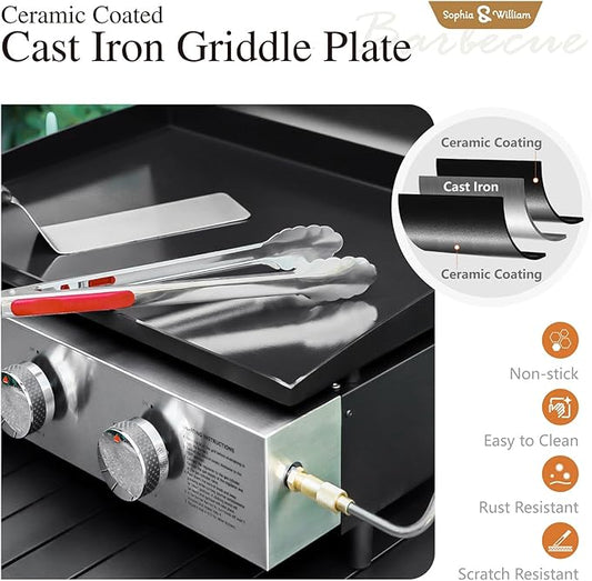 Sophia & William 22" Flat Top Grill with Lid & Ceramic Coated Cast Iron Pan, 3-Burner Portable Tabletop Gas Propane Griddle for Outdoor, BBQ, Camping & Tailgating Barbecue, 24,000 BTU