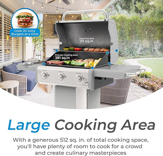 Kenmore 3-Burner Propane BBQ Grill, 30,000 BTUs Gas Grill with Cast Iron Cooking Grates, Folding Side Tables & Wheels, Outdoor Grill with Tool Hooks, Pearl White + Bonus Cover