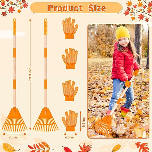 4 Pcs 35'' Kids Rakes for Leaves - Plastic Rake Head with 4 Pairs Kids Gloves, Small Kids Lawn Rakes Detachable Wooden Handle, Autumn Garden Tool Set for Kids Boys and Girls, Orange, 3yr+