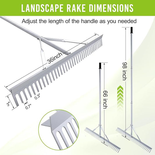36 Inch Aluminum Landscape Rake, Garden Rake, Heavy Duty Rakes for Lawns, Metal Rake for Gardening, Loosening Soil, Lawn Care, Lake and Beach