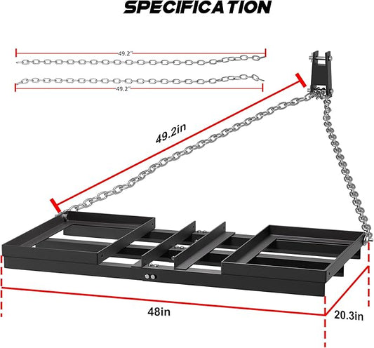 4FT Harrow Rake Driveway Grader,50 LB Heavy Duty Tow Behind Lawn Rake for Lawn Land Leveling Gravel Driveway Drag Harrow,Mower, Tractor, Black