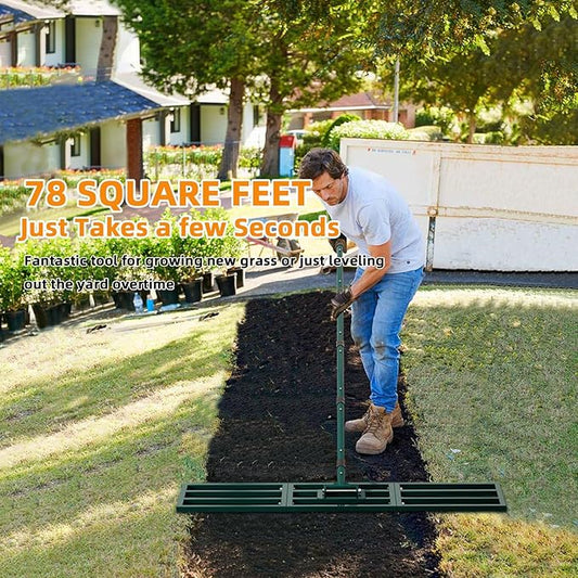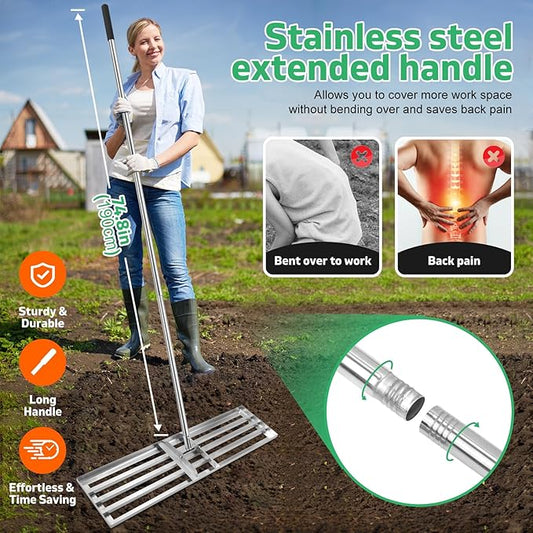 Lawn Leveling Rake Heavy Duty Stainless Steel Lawn Leveling Tool 30”x10” with 78” Adjustable Long Handle Leveling Rake for Soil,Ground,Backyard,Golf Field,Garden Tools Grass Seed Landscaping
