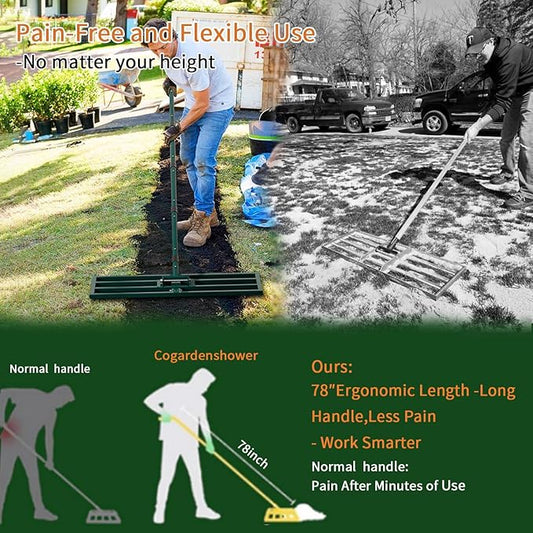 Lawn Leveling Rake Heavy Duty Stainless Steel Lawn Leveler Tool 45”x10” with 78” Adjustable Long Handle Yard Level Rake for Soil, Ground,Backyard Dressing,Golf Field,Garden Tools Grass Seed