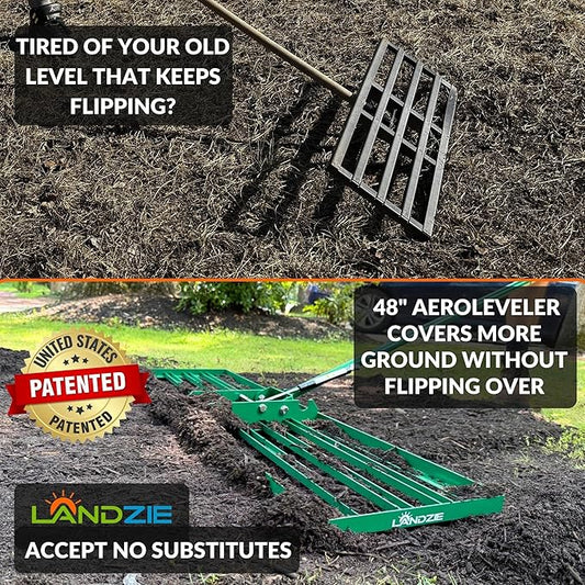 Landzie AeroLeveler - The Lawn Leveling Rake That Never Flips - Patented inch Wide Pneumatic Lawn Level for Yard, Dirt, Soil, Sand, Provides Stability and Control (Pneumatic 48" Leveling rake)
