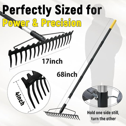 Bow Rake, 68-Inch Adjustable Handle Garden Rake with 17 Steel Tines, Heavy Duty Dual-Sided Metal Rake Landscape Gardening Tool for Soil Loosening Lawn Yard Leaves Mulch Thatch Removing