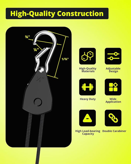 VIPARSPECTRA Retractable Heavy Duty Ratchet Tie Down Straps [8 Pack, 8ft, 75lbs/Pack], Rope Pulley System with Carabiner Hook Rope Adjuster for Hanging Plants/Grow Light/Tents Various Tie-Down Uses