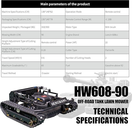Robot Remote Control Lawn Mower 22HP 65° Climbing Adjustable Mowing Height Track Drive All Terrain Grass Cutter Yard Mower (HW 608 90L)