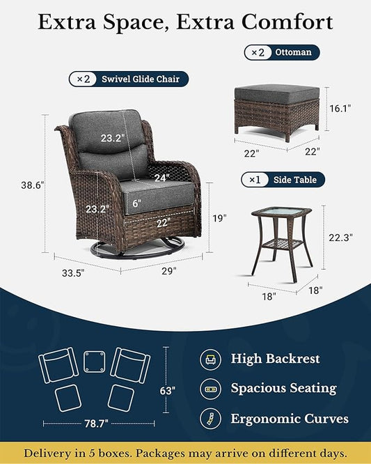 HILLGA Luxury Outdoor Swivel Rocker Patio Chairs of 2 with 6 Inch Thick Cushions and Side Table, Swivel Outdoor Chairs 5PCS High Back Wicker Patio Furniture Set for Porch, Balcony, Deck in Dark Grey