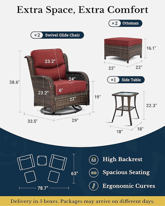HILLGA Luxury Outdoor Swivel Rocker Patio Chairs of 2 with 6 Inch Thick Cushions and Side Table, Swivel Outdoor Chairs 5PCS High Back Wicker Patio Furniture Set for Porch, Balcony, Deck in Burgundy