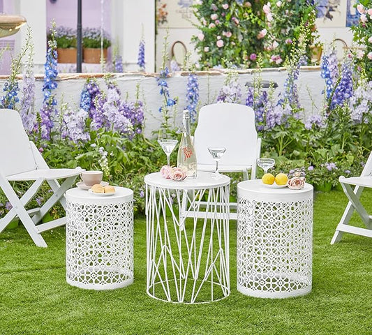 HFHOME Set of 3 Metal Side End Tables Nightstand, Nesting Round Coffee Table for Indoor Outdoor, Heavy Duty Metal Plant Stand Living Room Garden Stool - White
