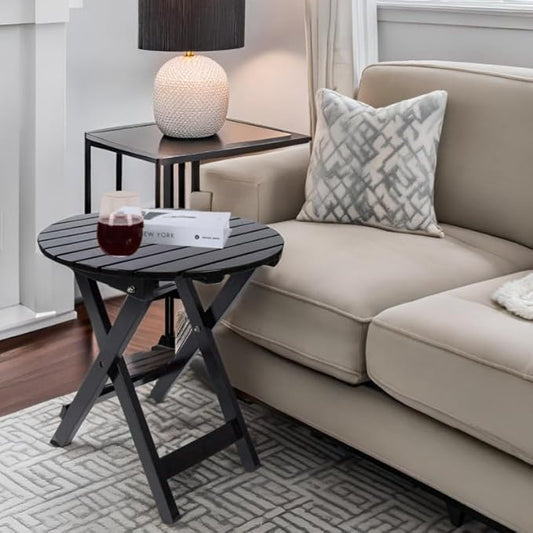 Outdoor Patio Side Table Round Small Wood End Table Folding Coffee Furniture for Living Room, Bedroom, Plant Stand, Camping Portable Black
