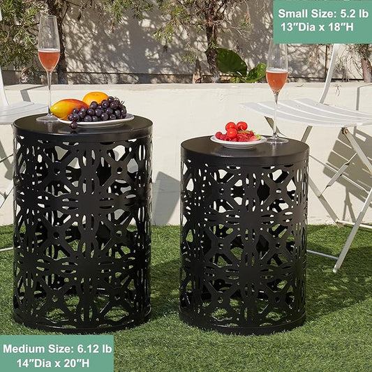 Y&M Set of 3 Garden Black Accent Decorative Stool, Nesting Metal Round Coffee Table, Black End Tables, Heavy Duty Meta Plant Stand Decorative Garden Stool, Outdoor Multifunctional Use