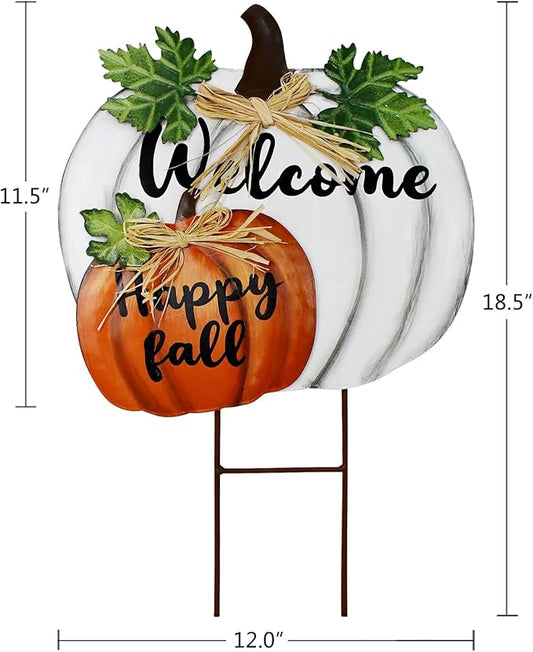 Morning View Pumpkin Garden Stakes Metal Yard Sign Fall Decor Outdoor Autumn Yard Stake Art Pumpkin Lawn Ornaments for Patio Porch Thanksgiving Halloween Harvest 30 Inches Tall Set of 2(White)