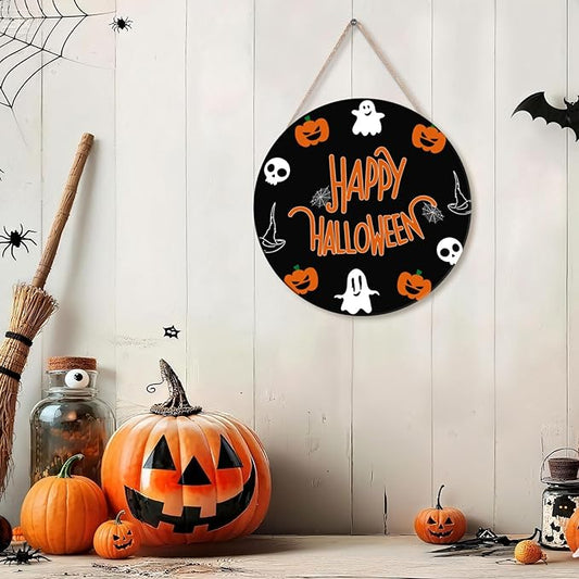 Halloween Decorations, Happy Halloween Wooden Ghost Hanging Sign for Front Door Hanger Wreath Decor, Wreath Cute Ghost Pumpkin Bat Front Door Decorations Hanging Sign, Indoor Outdoor Yard Wall Party