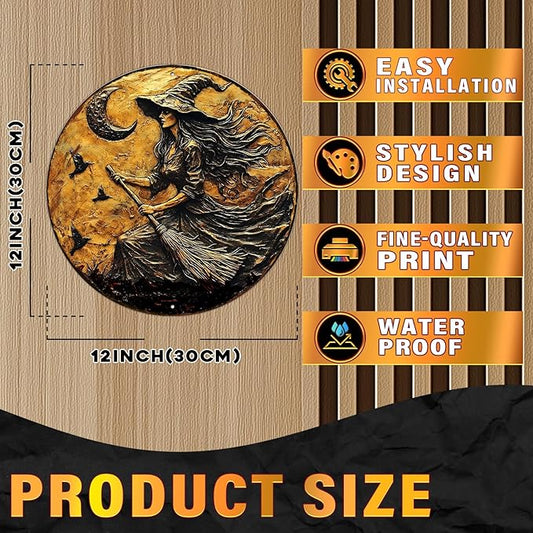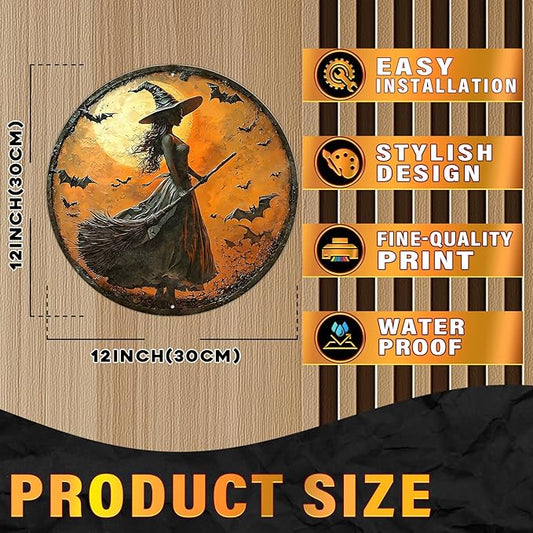 PEACHGARDEN Round 2D Halloween Witch Broom Vintage Sign Halloween Witch Metal Tin Sign for Home Bar Kitchen Hotel Dining Room Coffee 12x12inch