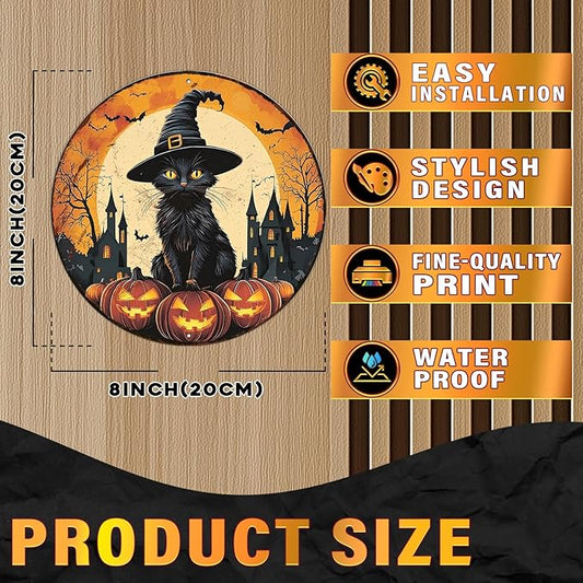 PEACHGARDEN Round Black Cat With Bats On Pumpkin Vintage Sign Halloween Metal Tin Sign for Home Bar Kitchen Hotel Dining Room Coffee 8x8inch