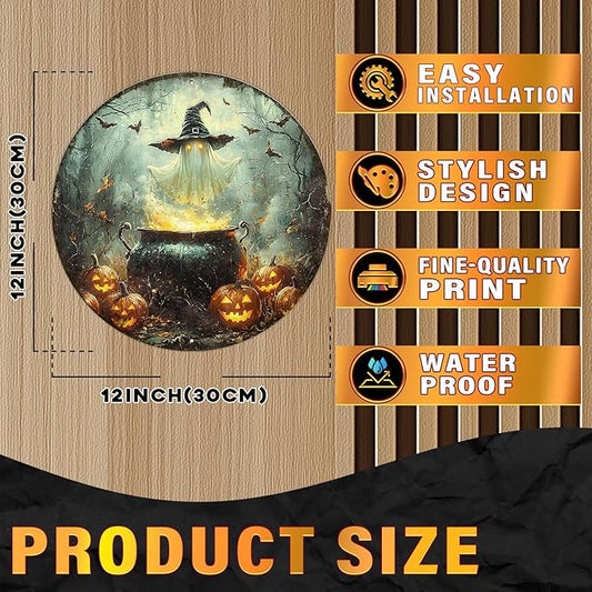 PEACHGARDEN Round Halloween Spooky Ghost With Witch Hat Wreath Vintage Sign Halloween Pumpkin Metal Tin Sign for Home Bar Kitchen Hotel Dining Room Coffee 12x12inch