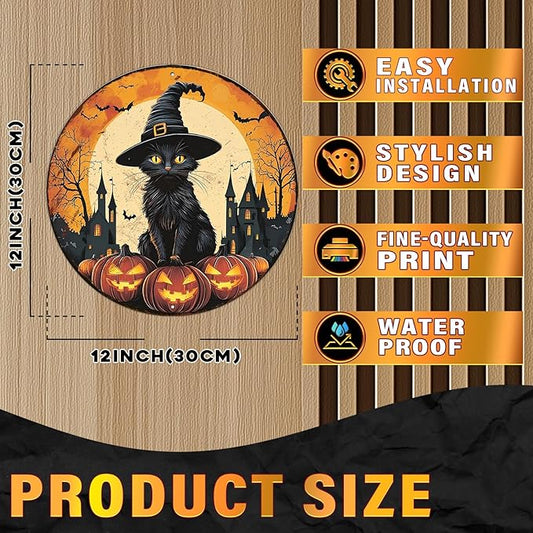 PEACHGARDEN Round Black Cat With Bats On Pumpkin Vintage Sign Halloween Metal Tin Sign for Home Bar Kitchen Hotel Dining Room Coffee 12x12inch