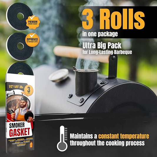 XXL 30 FT Grill Gasket for Smokers - Black 1/2’’ x 1/8’’ Hi Temp Seal Smoker Gasket – 3-Pack x 10 FT Self Stick Black Nomex Fire Tape for BBQ Lid – High Heat Temperature Material Replace