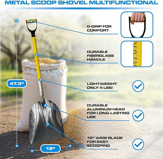 Plexon Metal Scoop Shovel 12" Blade - Aluminium Steel Snow Shovel for Driveway - Heavy Duty Snow Shovel for Car - Fiberglass Handle & Plastic D-Grip - Outdoor Garden Yard, 48" Length