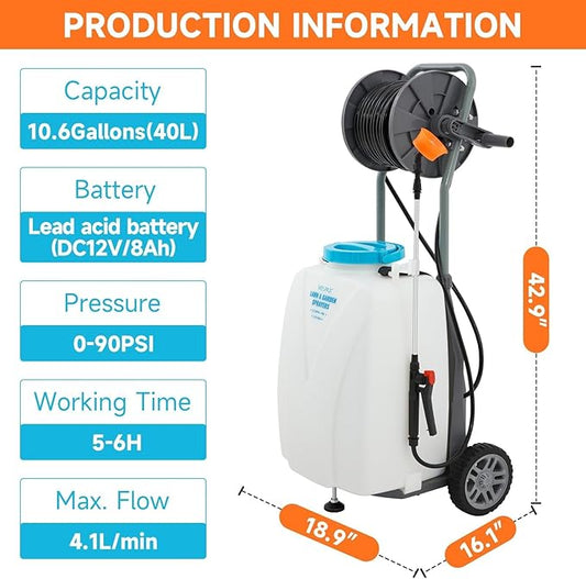 10.6 Gallon Battery Powered Sprayer with Double Professional Pump, Portable Sprayer with Wheels,0-94 PSI,12V 8Ah Battery,Adjustable HD Wand and 10 Nozzles for Weeding, Spraying, Cleaning