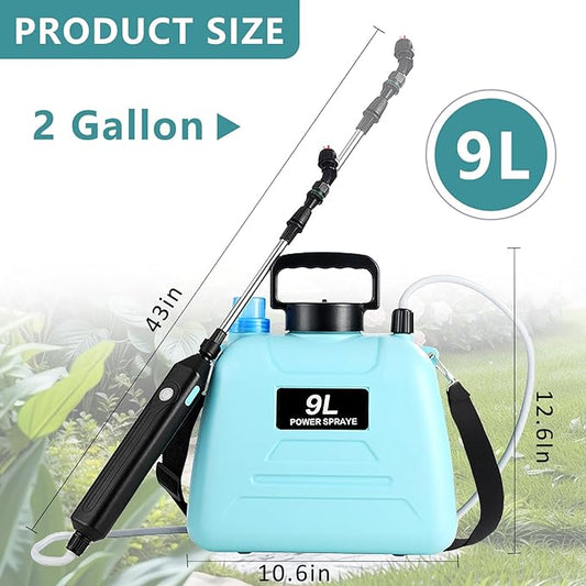 Battery Powered Sprayer, 2.4 Gallon Electric Garden Sprayer, Automatic Power Weed Spray Battery Operated with Adjustable Shoulder Strap and Rechargeable Handle for Yard, Lawn, 3 Mist Nozzles (Blue)