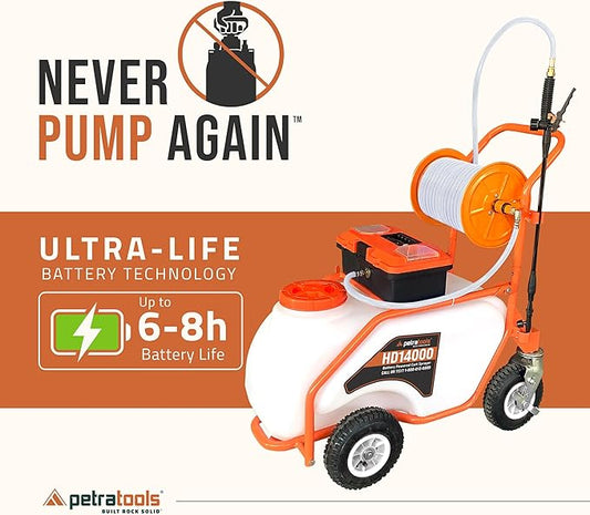 PetraTools 14 Gallon Push Cart Battery Powered Sprayer - Weed Sprayer for Lawn & Garden with 7 Nozzles, 90 PSI Electric Pump, Off Road Wheels, Battery Operated (HD14000 Prime - Large Cart)
