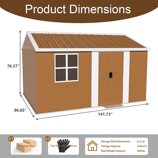 12x8 FT Outdoor Steel Storage Shed with Clear Windows, Sliding Lockable Door & Ventilation, Brown and White Weather-Resistant Metal Tool Shed for Garden, Backyard, Lawn, and Utility Storage
