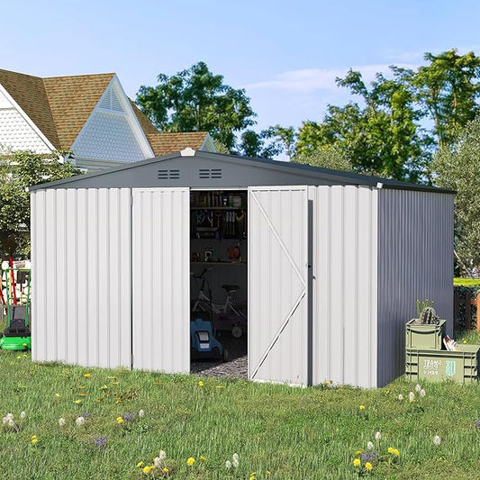 ACOJOY 10'x10' Shed, Large Metal Storage Sheds & Outdoor Clearance, Steel Backyard Shed with Lockable Doors, Utility and Tool Storage for Garden, Patio, Outside Use in White