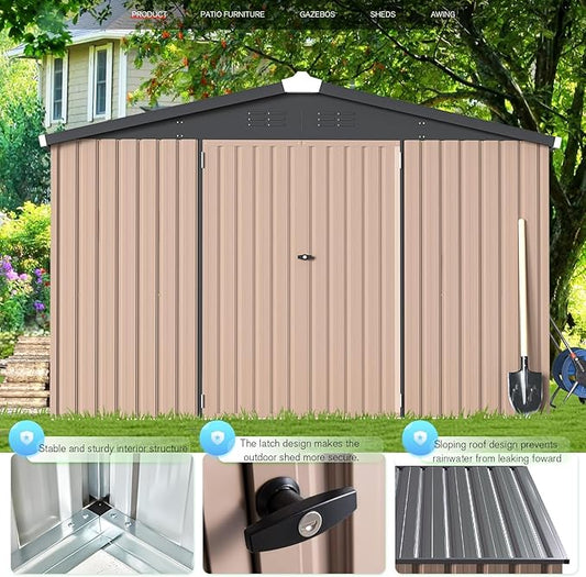 8x12FT Outdoor Storage Shed, Metal Garden Shed with Lockable Double Doors & Sloping Roof, Weather-Resistant Tool Shed for Backyard, Patio, Poolside Brown