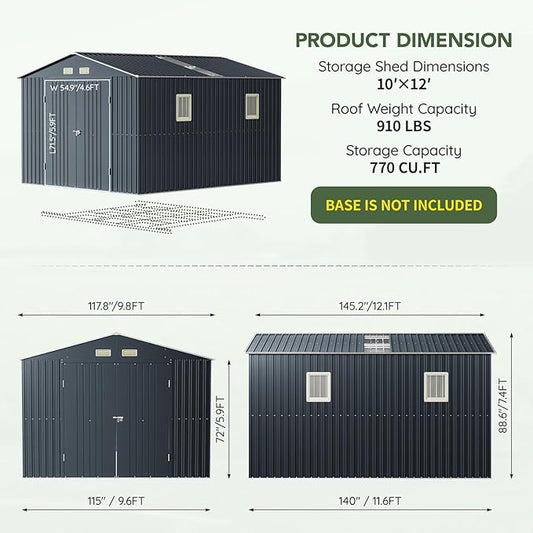 10x12 FT Outdoor Metal Storage Shed with Floor Frame, Double Swing Doors, 2 Clear Windows, Replaceable Skylight Roof Panel, Tool Shed for Garden, Patio, Backyard