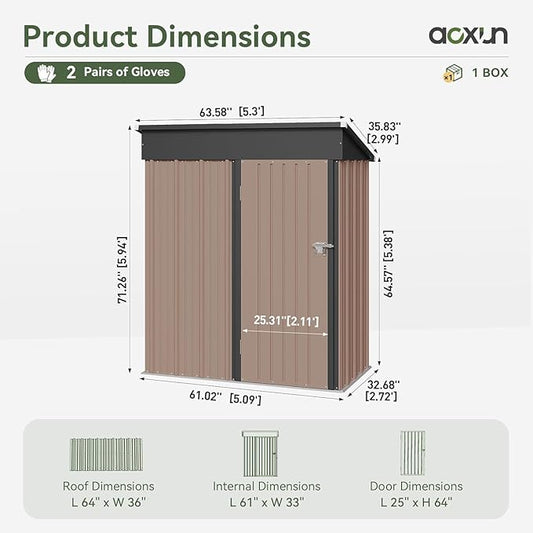 Aoxun 5x3 ft Galvanized Metal Outdoor Storage Shed with Base Slanted Roof Tool House with Stainless Latch & Base Frame Durable Weather-Resistant Garden Shed for Patio, Brown
