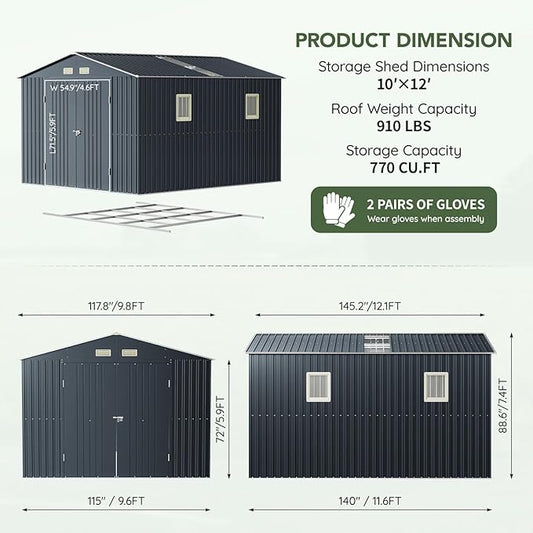 10x12 FT Outdoor Metal Storage Shed, Double Swing Doors, 2 Clear Windows, Replaceable Skylight Roof Panel, Tool Shed for Garden, Patio, Backyard
