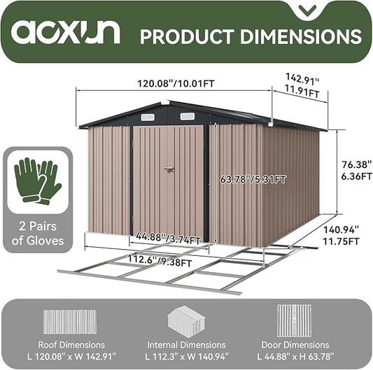 Aoxun 10 x 12FT Outdoor Storage Shed with Base Utility Garden Shed with Lockable Door & Sloped Roof Metal Sheds Outdoor Storage for Garden, Backyard, Patio and Backyard,(Brown/Base Included)