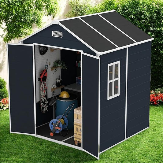 Outdoor Storage Shed 6x6 FT, Resin Shed with Floor & Window, Lockable Door, Vents, Outside Sheds & Garden Shed for Patio Furniture, Gardening Tools, Pool Equipment (Dark Gray, 6 * 6ft)