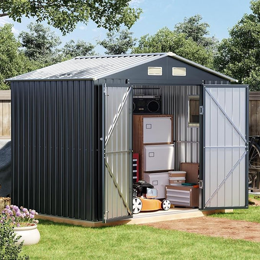 10x8FT Outdoor Storage Shed, Metal Garden Shed with Lockable Double Doors & Sloping Roof, Weather-Resistant Tool Shed for Backyard, Patio, Poolside Black