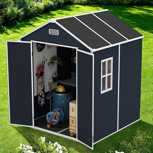 Resin Storage Shed 6x6ft Outdoor Tool Shed with Floor, Window, Lockable Doors and Vents, 12mm Thick pp Board, Storage Sheds for Patio, Garden, Backyard, Lawn (Dark Gray, 6 * 6ft)