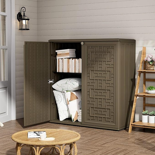 ZZM HDPE Outdoor Storage Shed, Outdoor Plastic Storage Cabinet, Horizontal Resin Tool Shed for Garden, All Weather Outdoor Storage Clearance, DIY Usage, with one Shelf (Coffee)