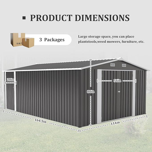 KEIKI 10x 14 FT Metal Storage Shed Outdoor, Large Garden Shed with Roof & Lockable Doors, Utility Tool Sheds Frame & 4 Vents for Patio Backyard Bicycles Storage House, All Weather Use, Dark Grey