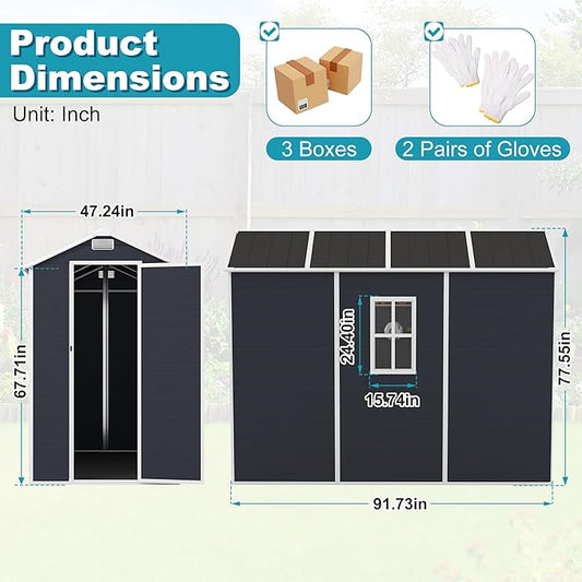 4x8 FT Plastic Outdoor Storage Shed, Resin Plastic Tool Shed with Lockable Doors & Peaked Roof, Garden Shed with Side Window & Floor, for Backyard Garden Patio Lawn, Dark Gray