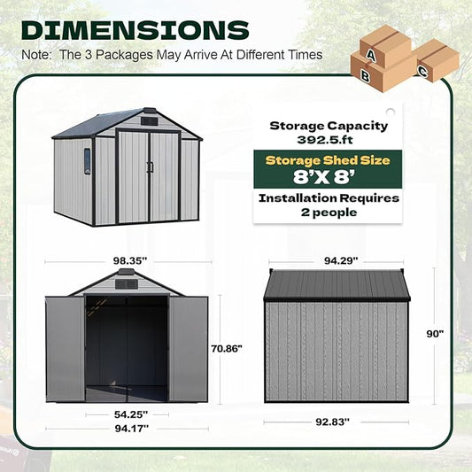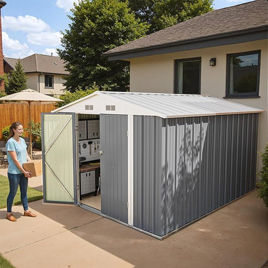 Greesum 8×10FT Outdoor Storage Shed, Metal Patio Storaged Sheds with Lockable Doors, Sheds & Outdoor Storage for Bike, Backyard, Pool and Garden, Gray