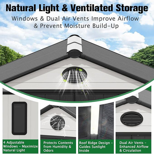 Outdoor Storage Shed, 8x6 FT Resin Shed with Floor and Lockable Door, Window & Vents, Tool Sheds & Outdoor Storage for Bike, Garden Accessories, Tools, Waterproof Grey White