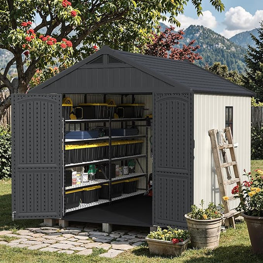 UDPATIO Outdoor Storage Shed 8 x 8 FT, Resin Garden Sheds Plastic Patio Outdoor Storage with Lockable Door for Tool, Bike, Garbage Can Gray White