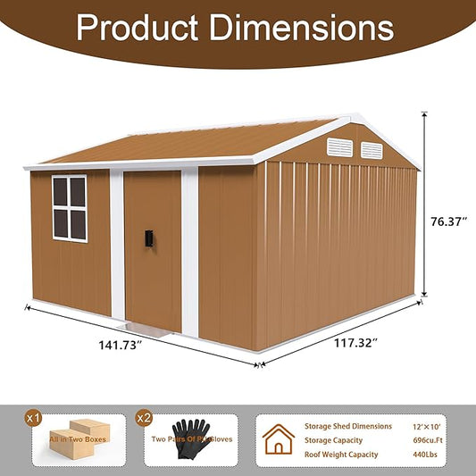 Outdoor Tool Shed 12x10 FT Heavy-Duty Metal Storage Shed with Lockable Door, Windows & Ventilation - Weather-Resistant Roof Garden Shed for Backyard, Patio, Lawn (Brown)