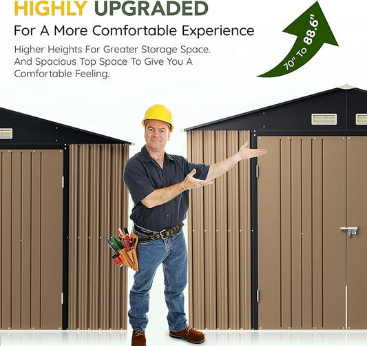 Breezz Outdoor Storage Shed 10 x 10ft. Utility Tool Shed Metal Storage Garden Shed with Lockable Doors & Windows for Patio Storage,Brown
