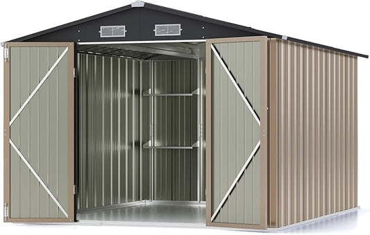 Patiowell 8x10 FT Outdoor Storage Shed with Detachable Storage Rack, Large Garden Tool Metal Shed with Sloping Roof and Double Lockable Door, Outdoor Shed for Backyard Garden Patio Lawn,Brown