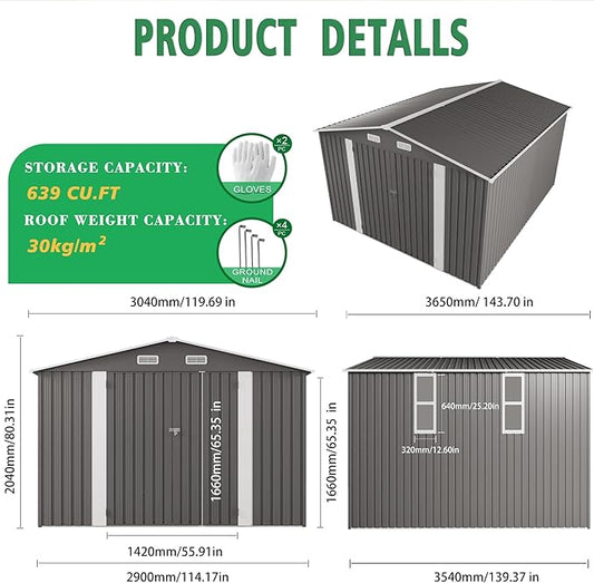 10x12 FT Outdoor Storage Shed with Windows, Metal Sheds & Outdoor Storage with Lockable Door and 4 Vents, Outside Storage Shed Waterproof for Backyard, Garden, Patio, Gray