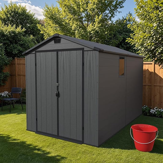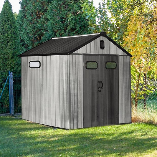 Domi 8x8 FT Outdoor Resin Storage Shed, All-Weather Double-Wall Storage Building for Backyard, Garden, Lawn Tools, Mower, Bike & Pool Equipment, Lockable Doors, Ventilated Roof, Grey